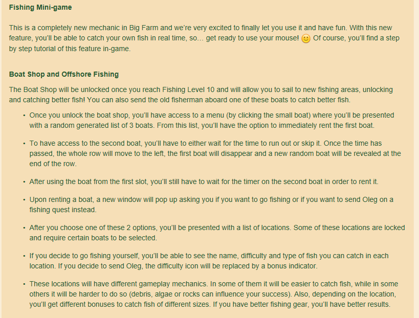 Esta es una forma completamente nueva mecánica en la granja grande y estamos muy emocionados de finalmente dejar que usarlo y divertirse. Con esta nueva función, podrás atrapar su propio pescado en tiempo real, así que ... a prepararse para utilizar el ratón! Por supuesto, usted encontrará un tutorial paso a paso de esta característica en el juego.