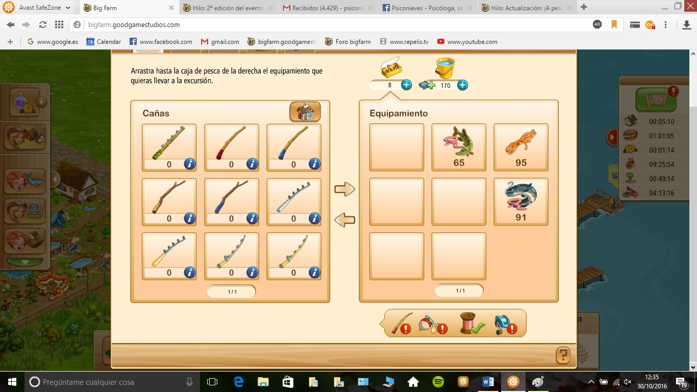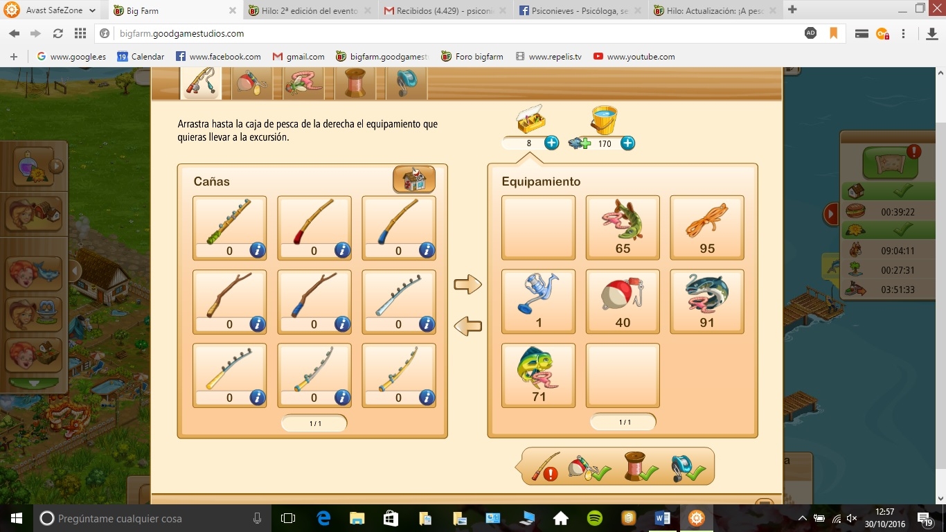O sea, la caña de junco y el carrete frontal ya no están, ¿adonde han ido?. Tampoco me han devuelto lo que yo tenía... Lo de abajo ya sale en rojo y sólo con un tic verde. He cerrado todo y he limpiado las cookies y cuando vuelvo a entrar sigue igual y milagro he descubierto que el cebo sencillo para peces limón que tenía está en los cebos pero no en el equipamiento. Eso sí, cuando lo he puesto en el equipamiento otra vez los 5 cebos avanzados para peces limón de repente se han convertido en 5 cebos secillos para peces limón, así por obra de arte. He cerrado la caja de pesca y la he vuelto a abrir y ya estaban otra vez en su sitio, o sea que tenía 5 cebos avanzados para peces limón.
