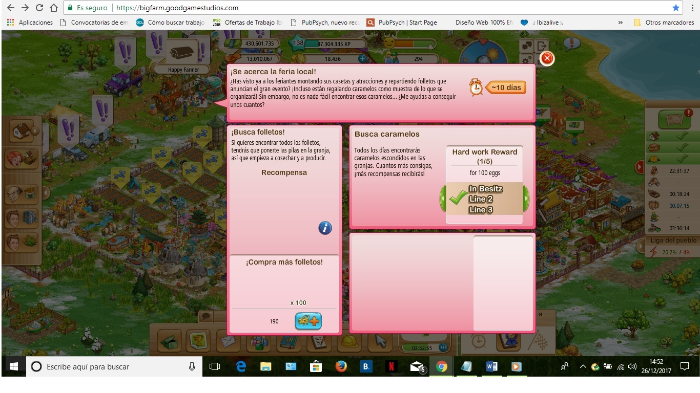 Bueno ha salido el evento de los caramelos y cuando se abre parpadea y bloquea completamente todas las granjas.Happy Farmer (ES1) dijo:Hola, no sé si va aquí o no pero el evento de la feria local se ha vuelto loco, cuando lo abro me sale casi todo en blanco y parpadeando con luces alrededor, ademas si después de abrirlo y cerrarlo voy a la granja gourmet por ejemplo se me abre pero sale como más oscuro y el ratón no deja hacer nada... He borrado cookies y cache y sigue igual, los folletos los recojo pero no sé si me los guarda o no y tampoco sé que tengo que buscar