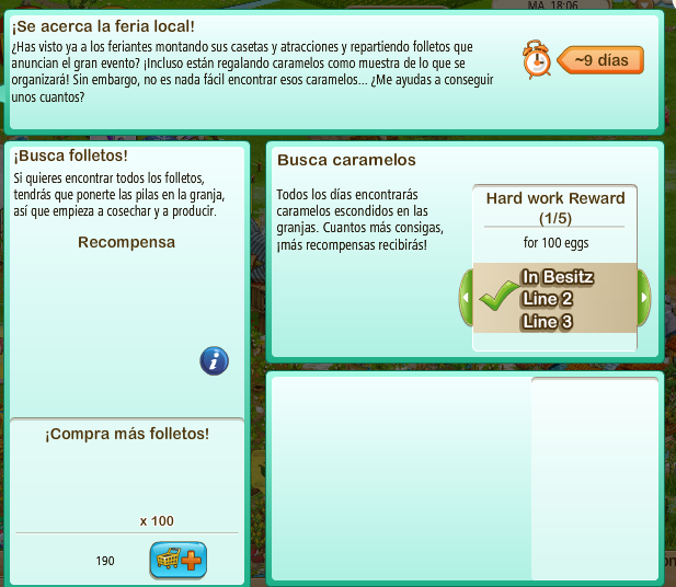 Hola, no sé si va aquí o no pero el evento de la feria local se ha vuelto loco, cuando lo abro me sale casi todo en blanco y parpadeando con luces alrededor, ademas si después de abrirlo y cerrarlo voy a la granja gourmet por ejemplo se me abre pero sale como más oscuro y el ratón no deja hacer nada... He borrado cookies y cache y sigue igual, los folletos los recojo pero no sé si me los guarda o no y tampoco sé que tengo que buscar