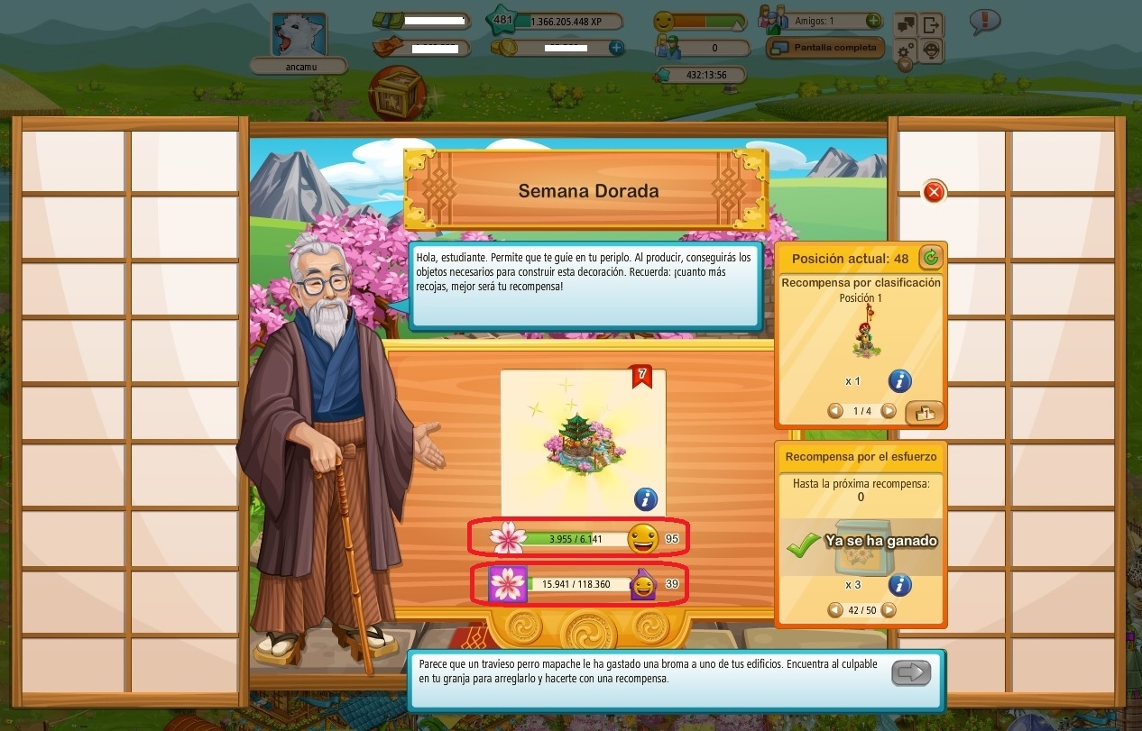 bueno, el evento no es perfecto, y la decoración de primer lugar no tiene tanta felicidad que digamos, pero también se debe tomar en cuenta el valioso espacio, no hay muchas decoraciones que tengan tanta felicidad en un espacio tan pequeño, además el que se lleve el primer lugar también puede elegir entre 4 opciones de recompensas, entre ellas otra decoración más espaciosa y con más felicidad.carlitos210212 (ES1) dijo:El Evento de la Semana Dorada Japonesa está muy bien pensado y genera diversión y compromiso colectivo, pero hubiera sido extraordinariamente Superior y mucho más atractivo si hubierais tomado la buena experiencia del Evento Nuevo Año Chino en cuanto a las Recompensas, colocando igualmente 20 Recompensas Diarias o el Total de forma continuada, pues es demasiado desproporcional la exagerada cantidad de Flores que piden para alcanzar alta Felicidad de la Decoración Final y las Pírricas Recompensas que Ofertáis para Compensar el Agobiante Esfuerzo que hay que Derrochar en un Evento de Gran Duración como lo es este....