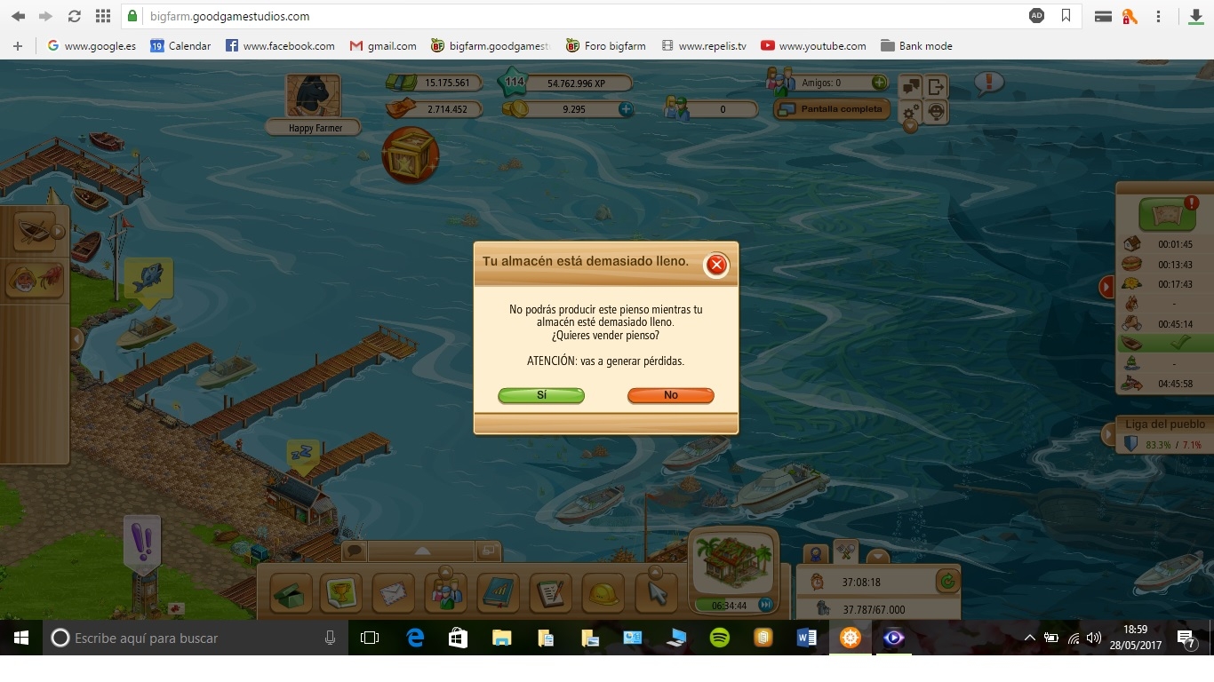 Lo que me dices es lo que yo pienso en pura lógica pero a saber como lo han hecho, El astillero hoy lo he pasado a nivel 5 por lo que dices aunque la barca Skipjach, ya la tengo , la he conseguido en el evento del gran trabajador. y el punto ese de saber que pesca trae cada barco antes de abrirlo ya lo hemos comentado muchos espero que lo hagan y pronto al igual que poner una ventana de construccion en cada granja que funcionen con independencia ya que como está ahora el juego se eterniza y se hace menos atractivo pero ya veremos lo que hacen. Gracias por tu informaciónCarlos1956 (ES1) dijo:Tengo 14 barcos la teoria es que puedas tener 24 barcos 4 por cada caladeros(6) los modelos que puede tener los que quieras depende del la cantidad de $ que te quieras gastar y despues subirlos hay que mirar todo, subir el astillero al 5 cuesta 5.200.000 pero lo tienes que subir si quieres la barca Skipjach que es nivel 6 de astillero.Y referente al cambio de los bancos cada 24 horas no es verdad me cambiaron ayer a las 11.00 de la mañana y a estas horas siguen igual (a saber si en el operativo automatico le han puesto ~) creo que tiene trabajo en solucionar muchas cosas.Mirar que cuando el barco este en el muelle se vea lo que lleva de pesca y ahora le das sin saberlo o si no lo apuntas nombre y lo que llevan das palos de ciego.