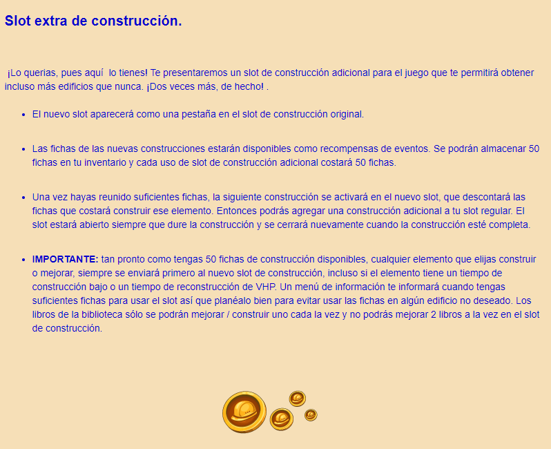 IMPORTANTE: tan pronto como tengas 50 fichas de construcción disponibles, cualquier elemento que elijas construir o mejorar, siempre se enviará primero al nuevo slot de construcción, incluso si el elemento tiene un tiempo de construcción bajo o un tiempo de reconstrucción de VHP. Un menú de información te informará cuando tengas suficientes fichas para usar el slot así que planéalo bien para evitar usar las fichas en algún edificio no deseado. Los libros de la biblioteca sólo se podrán mejorar / construir uno cada la vez y no podrás mejorar 2 libros a la vez en el slot de construcción.