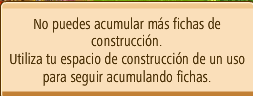 Lo que, en principio, era una muy buena idea, el doble espacio de construcción, se convierte en una nueva tomadura de pelo cuando no deja almacenar mas de 50 fichas. En este momento tengo 55, espero conseguir la recompensa numero 22 del evento del Gran Trabajador que consiste en 15 fichas mas. Sin embargo, las perderé por no poder hacer uso de ellas y no permitir que se acumulen . Así da gusto, te doy una cosa pero antes de que vayas a cogerla te la quito de las manos.