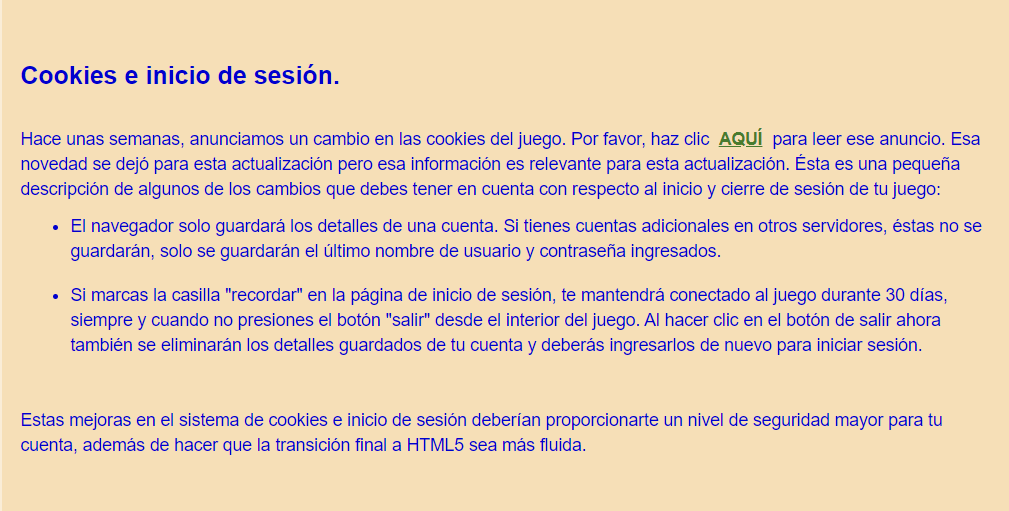 Hola, desde la actualizacionde ayer, cada vez que quiero entrar en el juego, me pide usuario y contraseña, tengo señalado el guardar contraseña, pero no funciona, hize limpieza de cookies y siguo igual... alguien mas le pasa?... tengo que mandar un mensaje a soporto, o desde aqui lo vais a solucionar....