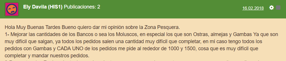 Buenas tardes.A mi personalmente me gustaria que: hubiera mas caladeros y con mayores variedades y cantidades de peces.En especial :gambas,ostras y almejas.Porque salen muy pocas veces y en pocas cantidades,pero en los pedidos siempren las suelen pedir y en grandes cantidades.Tambien que a la hora de subir el astillero y las embarcaciones a los niveles mas altos,se bajara el precio ,se piden muchos dolares,una locura. Que las embarcaciones y marineros,que no utilicemos se puedan vender o intercambiar ,en lugar de borrarse y no obtener nada.