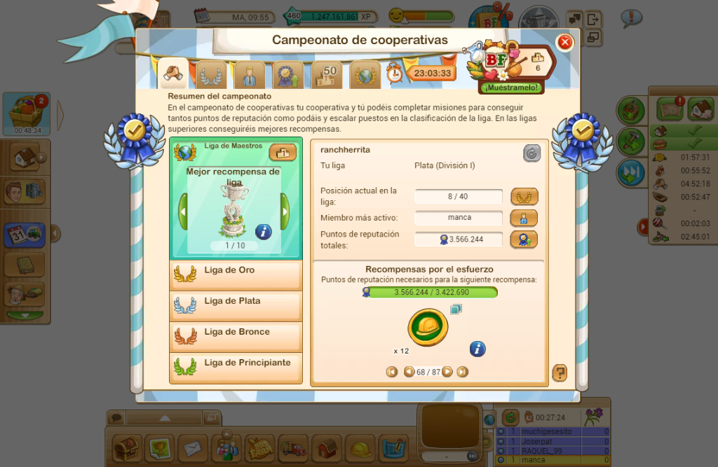 El ultimo dia del desafio de cooprativas anterior, hice tiradas en la ruleta y quede entre los 50 primeros, pero no me contabilizo en mi puntos de reputacion los 200 mil puntos que me deberian dar por estar entre los primeros, Si estaban en las notificaciones, pero de que me sirven si cuando yo abro la granja el evento ya se a terminado, creo que deberian contabilizar en cuanto terminase la ruleta como antes.