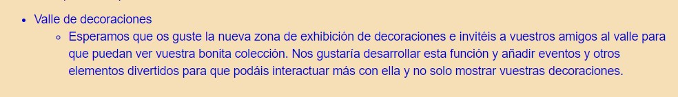 Hola¡ Bueno días, si el valle de las decoraciones no tiene ninguna función mas que de exhibir para que lo ponen?. Bueno debieran hacer actualizaciones para mejorar lo que hay y no crear cosas nuevas hasta que todo funcione como debiera. Que pasa con el mercado ecológico se aportan productos pero la barra sube muy poco, y no decir de la pesca que ya me tiene desilusionada tanto pescar e invertir y nada de resultados. Se que los moderadores se esfuerzan por darnos lo mejor y personalmente se los agradezco. Pero, detengansen a pensar no es mejor revisar y cualificar lo que ya se tiene? y hasta que no este funcionando como debe ser crear cosas nuevas. El juego es para divertirse y no para estresarse, Para esto último, tiene uno los problemas de la vida real. Gracias Una feliz Navidad para todos y todas.