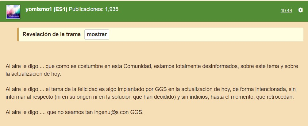¡¡¡ Sin comentarios!!! ni son necesarios ni son merecidos, GGS sabe muy bien lo que ocurre. Y si no pone los medios, más recursos y más ganas, lo único que va a conseguir es que Big Farm desaparezca, por el hartazgo y subsiguiente inactividad de los jugadores, quedando únicamente como un juego para el recuerdo, que empezó bonito y al que apetecía jugar y terminó de aquélla manera, como consecuencia de la ineptitud, desidia y avaricia de aquellos encargados de su gestión.