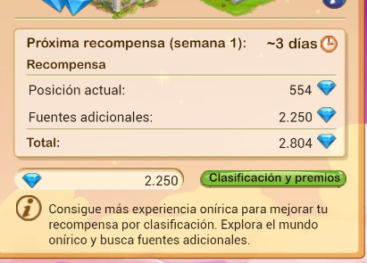 554 Diamantes por tu posición en la tabla, eso varia en funcion de los xp que ganas durante la semana completa.2250 Fuentes adicionales son los diamantes que se ganan por las tareas cumplidas, como poner campos, establos, limpiar terrenos, etc. (Las tareas propias de la barra izquierda que dan diamantes que se acumulan en este apartado)." ¡