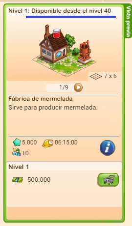 https://community.goodgamestudios.com/bigfarm/es/discussion/comment/4327504/#Comment_4327504 - sobre la fábrica de mermelada, puedo decirte que se pueden construir un máximo de 3 edificios en la granja gourmet y que se mejoran de nivel con dólares.