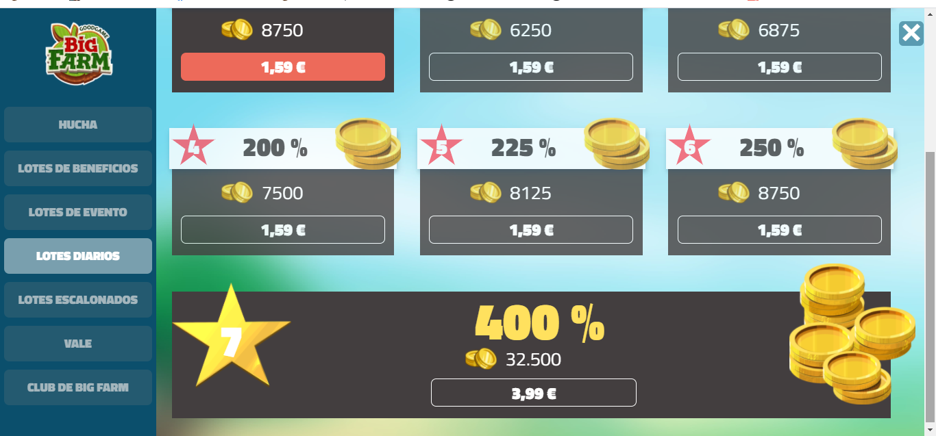 No hay trampa, es cómo tú dices, mientras recojas los productos de los campos, aparecerán cerditos de oro y cuando tengas suficientes entre 5,000 y 26,000, podrás comprar esa cantidad de oros por el precio que te aparezca en pantalla. Lo único que debéis recordar es que es una oferta por tiempo limitado y la compra debe hacerse antes que finalice dicho evento. He aquí un ejemplo para que se vea más claro: