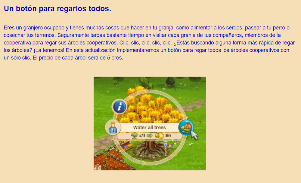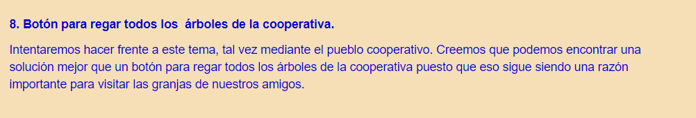 Aportas tres sugerencias diferentes y las tres muy interesantes para valorar y pasar al Equipo de Big Farm.Dejaré en este hilo, sólo la parte que hace mención al regadío del árbol cooperativo, las otras dos, serán trasladadas al Buzón de sugerencias, elogios y críticas, para que los