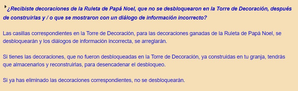 Buenos dias, a parte del oro que nos quitaban cada vez que abriamos el taller de papa noel, tambien he compoobado otra incidencia, al poner la decoracion conseguida en mi granja mi sorpresa fue que no me la añade a la torre de decoraciones. Mando captura para que se vea.
