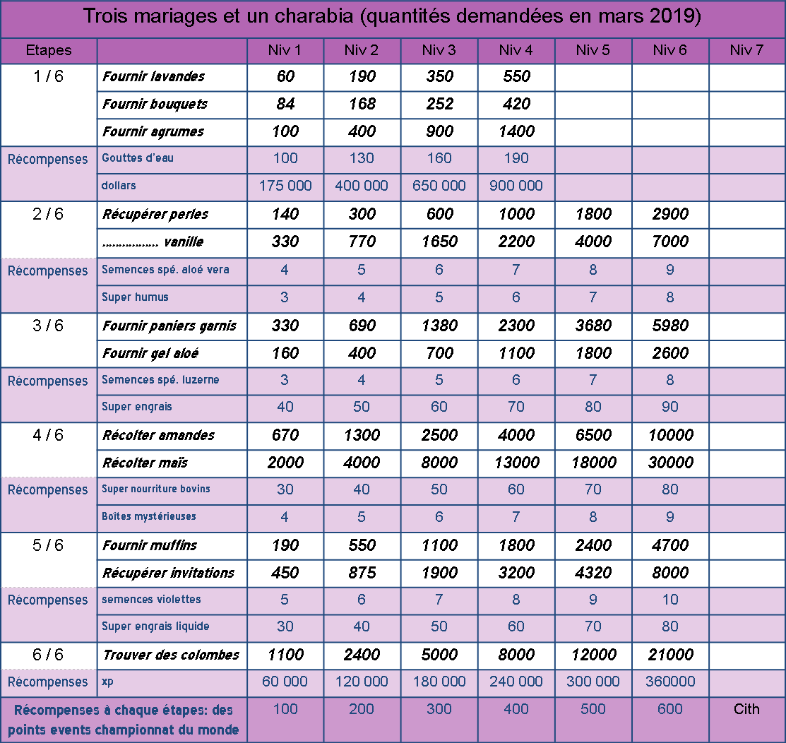 En venant rechercher les quantités pour l'évent, je m'aperçois que je n'avais pas fini de remplir le tableau avec le niveau 4 et 6.