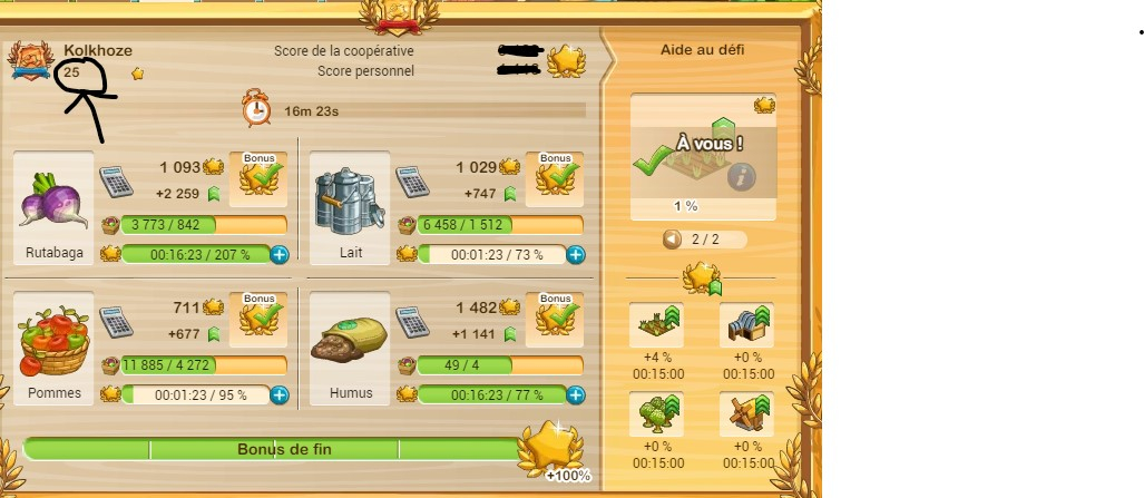 Mais je suppose qu'il y a 1 calcul précis dans le programme du jeu qui détermine l'"indice" de chaque défi et qui est basé sur le nombre total de points à réaliser quand on récolte toutes les quantités des 4 produits demandés.