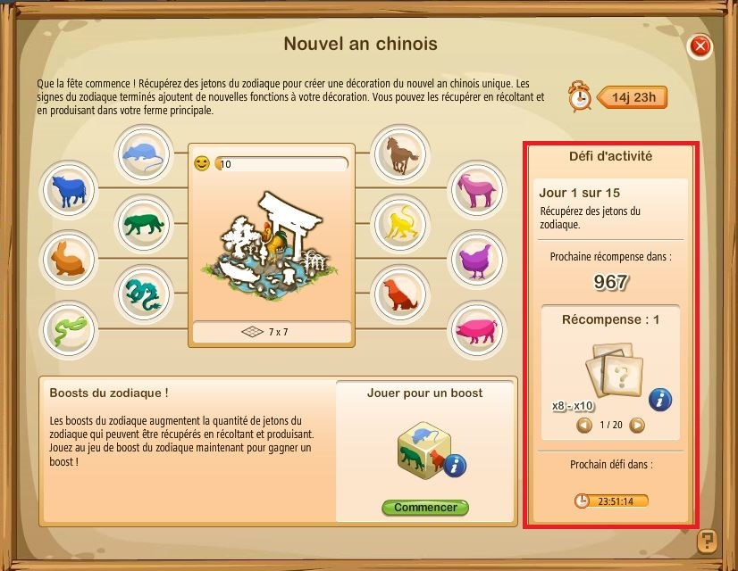 Sur la droite, des défis d'activité journalière nous sont proposés ; ces activités nous permettent de gagner quelques récompenses supplémentaires