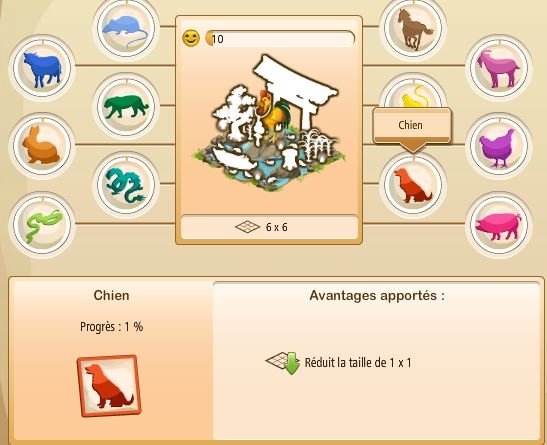 Quand on passe le curseur sur l'un des signes, dans l'encadré du bas, on voit l'avantage que ça nous donne, par exemple, ici, on voit que le signe du chien nous permet de réduire la taille de la décoration