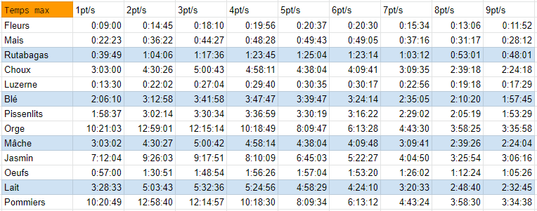 Voici le tableau qui reprend le temps maximal que l'on pourrait passer sur un palier, à condition de récolter en une fois ce qui est nécessaire pour arriver à la limite de ce palier.