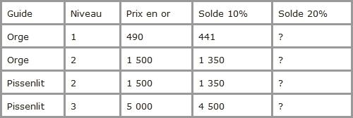 Tableau répertoriant tous les guides ainsi que leurs prix (normal et soldé)