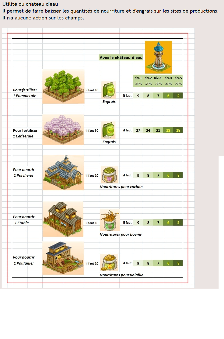 Le château d'eau permet de réduire, par exemple, le nombre de nourriture nécessaire pour lancer une production sur un bâtiment d'animaux. Pareil pour les besoin en engrais sur les vergers