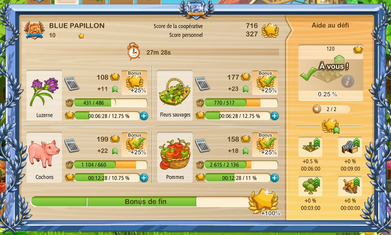 - timouty, p6/5 : 30 mn: 517 fleurs, 486 luzerne, 660 cochons, 2136 pommes