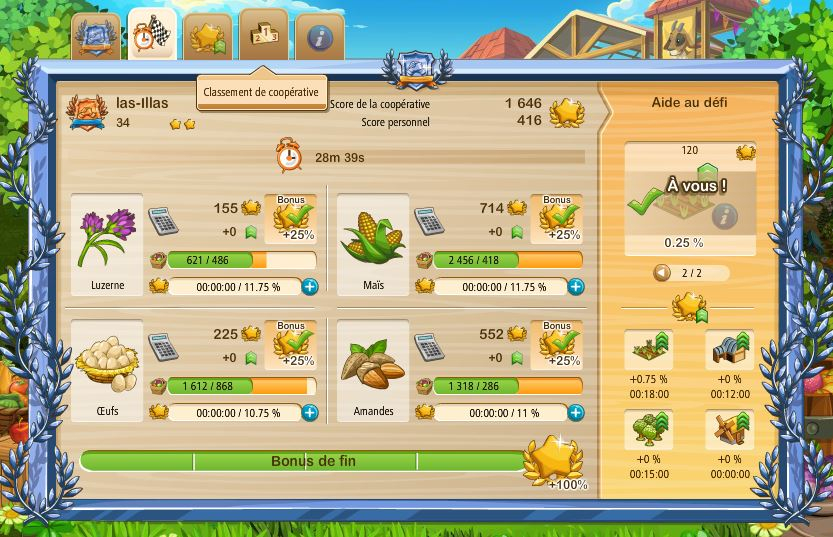 indice 223 or : 6k oeufs (+2k amandes + 3k ruta et 1k blé) / c pas du délire pour un 223 ? rosettafarm = 7 membres de niv 15-35 et de telles quantités en 30mn ?