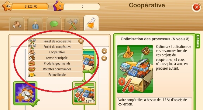 Lorsque vous cliquez sur la fiole orange, vous devriez voir ça après avoir choisi (sur mon exemple) Gestion de la Ferme dans le menu déroulant :