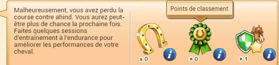 Je m'interroge sur le niveau compétitif des chevaux. Si mes infos sont exactes, + 2 points d'expérience pour un défi gagné, + 1 point d'expérience pour un défi perdu.