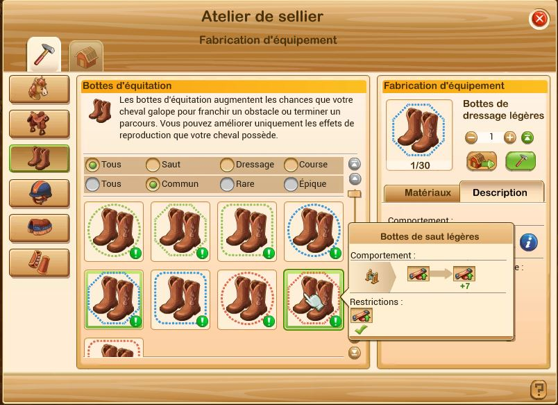 - saut d'obstacles : augmente les chances de comportement fonceur en compétition de saut d'obstacles et augmente les chances de comportement récalcitrant dans les autres compétition