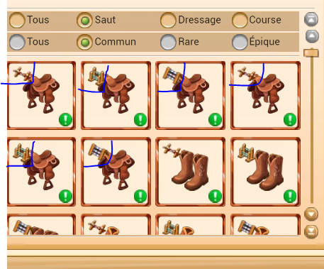 A chaque obstacle sa selle (je ne sais comment ils font pour en changer si vite) idem pour les bottes ect... J'ai cru comprendre que pour avoir un boots il faut parfois 5 selles parfois une ...