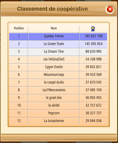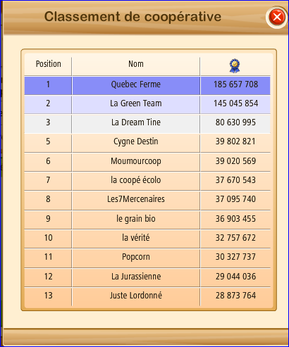 Juste pour répondre à ce passage de ton post. Le classement que chaque coop voit montre les 3 premiers du classement, puis les 4 coops juste au dessus, la coop où l'on est et les 4 coops juste en dessous. Donc la position du grain bio ne permet pas de voir la 4ème coop du classement mais je t'assure qu'elle y est bien ![]()