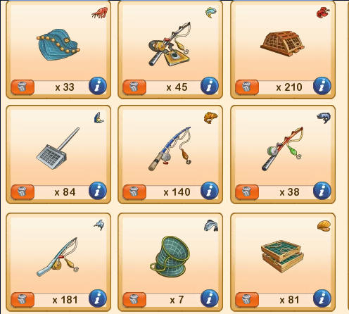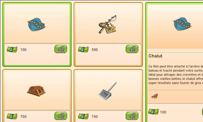 Une autre proposition: quand j'achète des ustensiles pour la pêche, je ne vois que le dessin de l'ustensile, il faut cliquer dessus pour voir quel poisson ou crustacé est concerné.