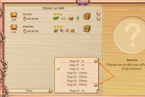 Quand on ouvre la fenêtre des défis, on arrive directement en ligue platine, page 56 (vous avez sans doute plus que ça sur le serveur FR), et les joueurs qui ne "prennent pas le temps" de lire ou d'observer ont tendance à cliquer sur la première qu'ils voient (13 heures et 200 000 aloe vera, etc etc).