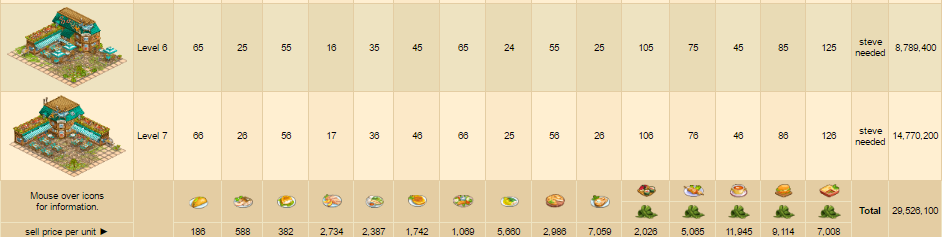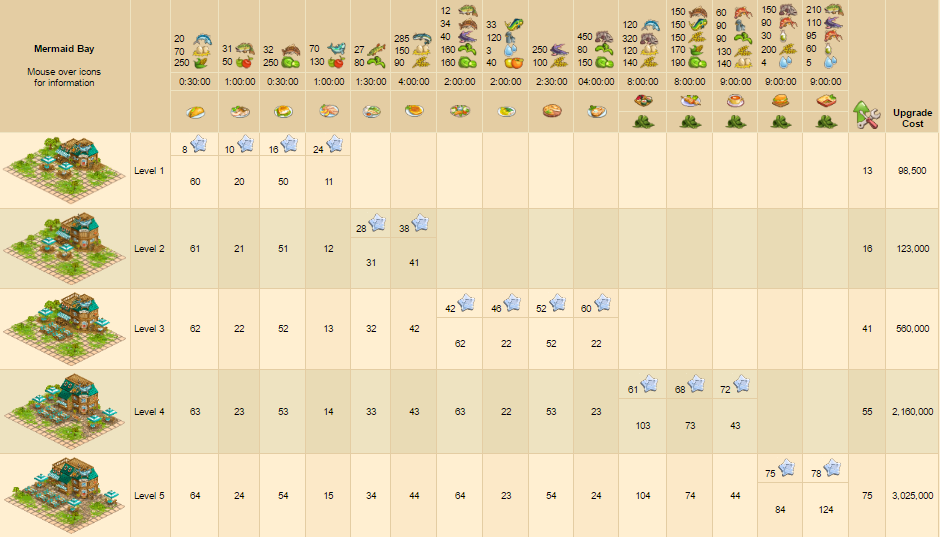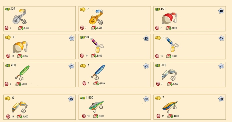 Felső sorban találjuk a hozzávalókat. Alatta az elkészítési időt. 3. sorban a készíthető étel képe (illetve ha hínárt is kapunk, annak a képe). Alatta pedig a szintekhez tartozó előállítható mennyiséget, és az étel előállításhoz szükséges horgászati szinteket látjuk. Utolsó oszlopokban fejlesztéshez szükséges szintet és a fejlesztési árat láthatjuk.