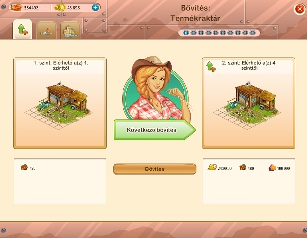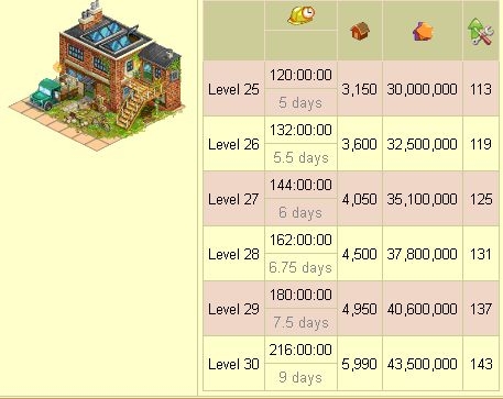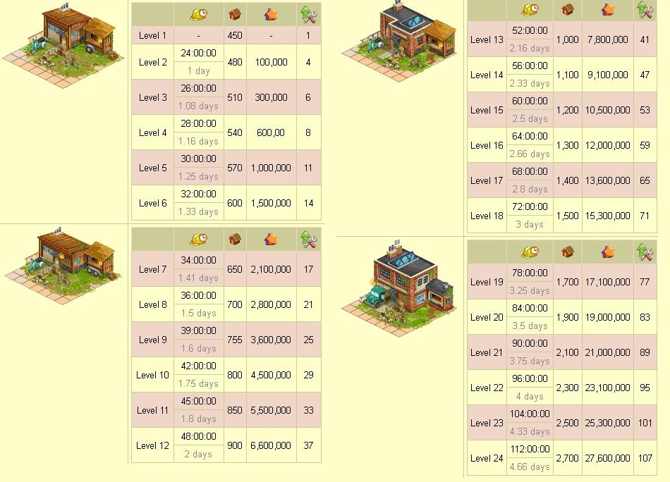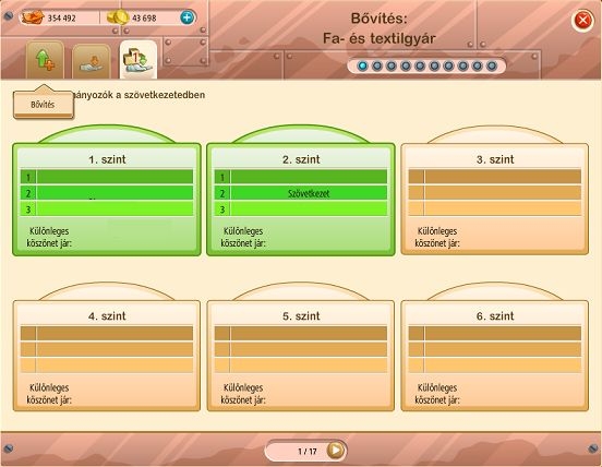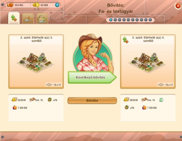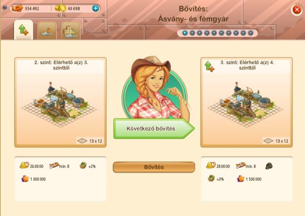 Látható az épület mérete, a következő szinthez szükséges fejlesztési idő, mennyivel nő a termelhető mennyiség, és fejlesztéskor mennyi szövetkezeti tapasztalati pontot kap a szövetkezet. Csak a szövetkezet fejlesztheti a gyárat, egyénileg nem kell fejleszteni.