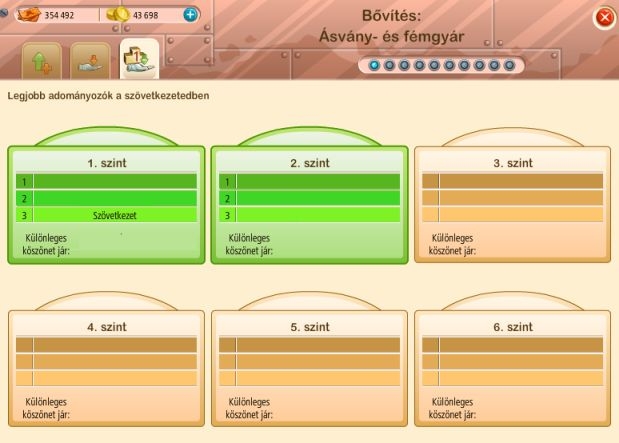 Itt látható, hogy adott szint fejlesztése során kik adták be a legtöbbet, valamint a Különleges köszönet azoknak jár, akik még jelentős mennyiséget adományoztak a fejlesztéshez.
