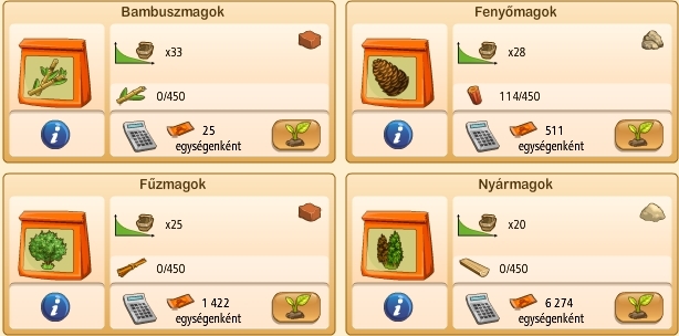 Ha a körmenü jobb ikonjára kattintunk akkor a megnyíló ablakban 4 fület találunk. Az első fülön találjuk az alapanyagokat. Ezek azok, amelyeket a földjeinkben peremnövényként termelhetünk.