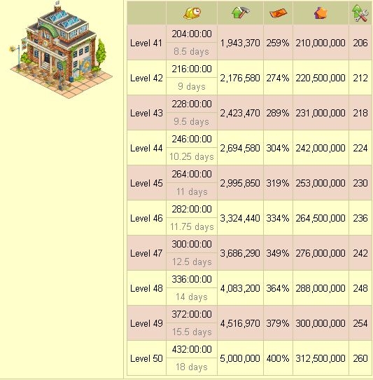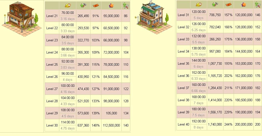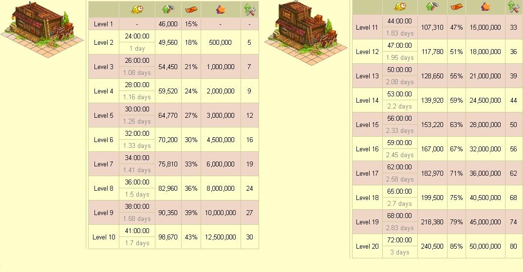Itt találjátok a Bankra vonatkozó információkat oszloponként: bank szintjei, fejlesztési idők, a fejlesztés után váltható összegek, a falusi dollár emelkedésének százaléka, a fejlesztés után járó falusi tapasztalati pont, szövifalu szintje.