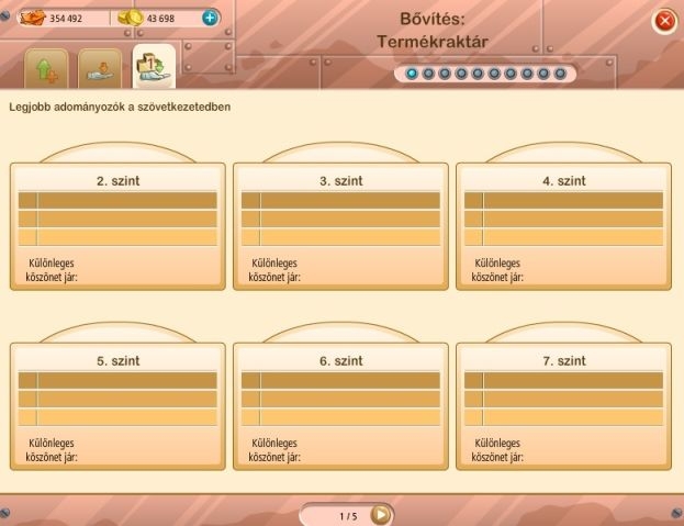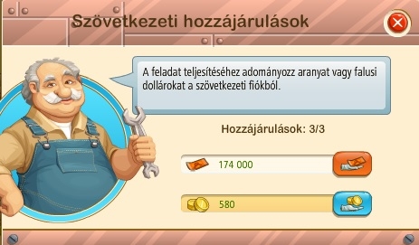 Szövetkezeti beadást csak a vezető és a képviselők érik el. (arannyal vagy falusi dollárral lehet kiváltani a beadandó termékeket,amelyet a szövikasszából von le.Viszont vigyázat,csak x mennyiséget lehet kiváltani.) Bal oldalon látható a beadott termékek összességében a 100%-ból mennyit tesznek ki, és alatta, hogy mikor történt utoljára adakozás. Minden nap 1%-kal csökkennek a mennyiségek. Mellette látható azon 3 személy neve és a beadott mennyiségének száma, akik az adott termékekből adott fejlesztési szinten a legtöbbet adományozták.