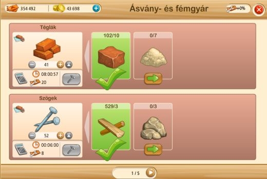 Ha a jobb oldali ikont választjuk a körmenüben, akkor attól függ, hogy az épületünk hanyas szinten van, s mely termékek gyártása oldódott fel a következőket készíthetjük: tégla, szögek, faszén, acél gerendák, vezetékek, színes lapok, cement, üveg, vasbeton.