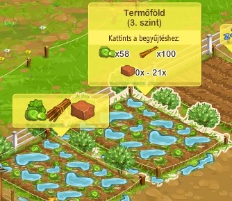 Kiválasztjuk a peremnövényt és rálépünk a jobb alsó (vetés) gombra.Ekkor a már elültetett normál növény mellett megjelenik a peremnövény, s a föld fölé véve az egér mutatóját látszik a normál növény és a peremnövény neve és termelendő mennyisége.