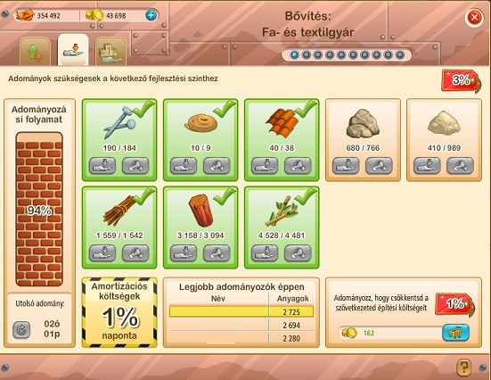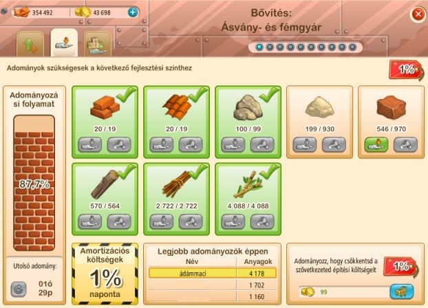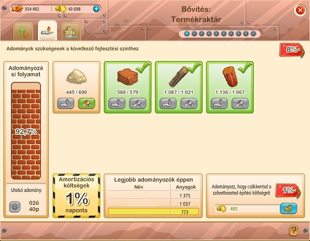 Minden nap 1%-kal csökkennek a mennyiségek. Mellette látható azon 3 személy neve és a beadott mennyiségének száma, akik az adott termékekből adott fejlesztési szinten a legtöbbet adományozták.