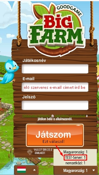 A bejelentkező oldalon, ahol a felhasználó neved és jelszavad adod meg, lent találsz egy lenyíló fülecskét, és ott válaszd ki a teszt szervert. Újrafrissül a lap, regisztráld magad. Ha megtörtént lépj be a teszt farmodra.