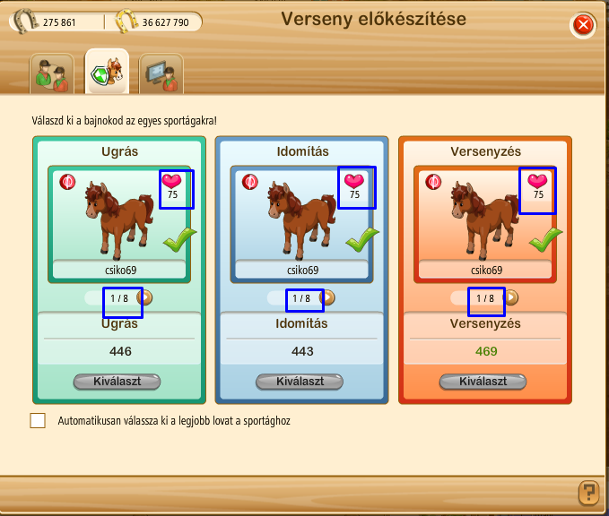 Zöld 3: Ha megvan,akkor zöld pipa jelzi,hogy ő az aktuális ló amit a többi játékos kihívhat.Ekkor a kiválaszt gomb elszürkül.