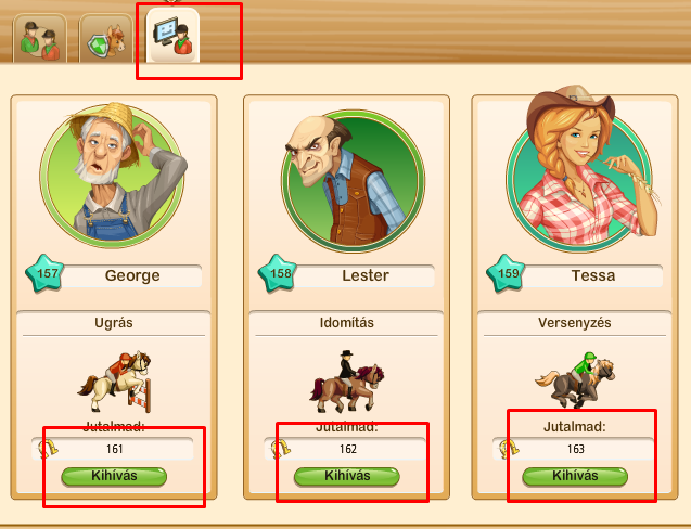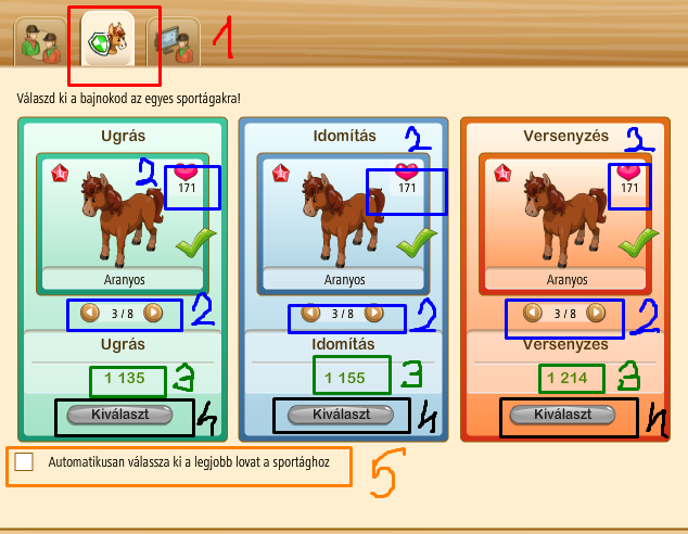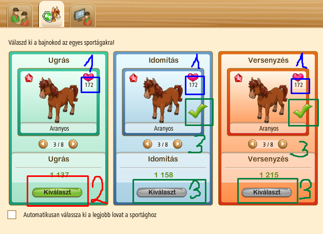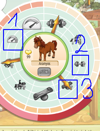 Kék 2: E 3 fül között lehet kattintással váltani aszerint,hogy erőben,állóképességben,vagy idomításban szeretnétek a lovatokat edzeni.