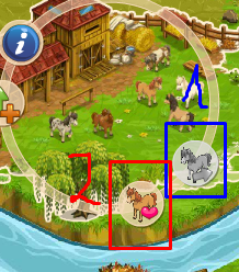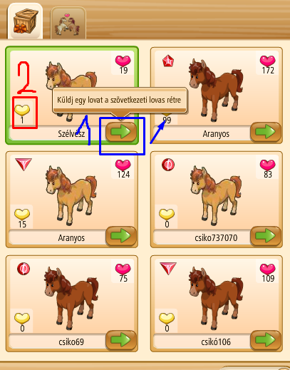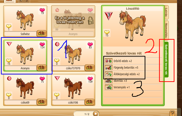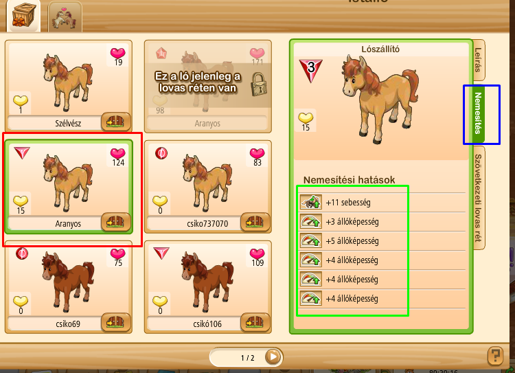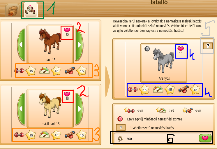 Piros 2.Az oldalsó zöld nyilak segítségével keresd ki a felső és alsó boxban is a 15 ös szintű lovat.(vagy amekkorák a lovaid nemesítéskor).