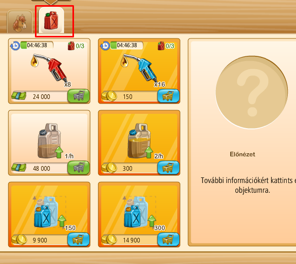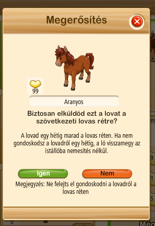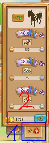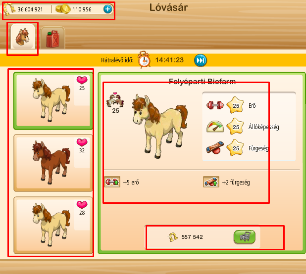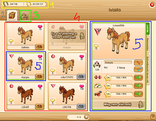 Piros 1: A ló zöld + jellel a vásárlógomb.Ha megnyomjuk,akkor x faludolcsiért vehetünk újabb 3 lovat.