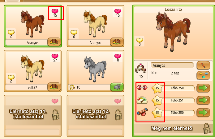0 ás szinten vásárolt lovat 15 ös szintre (szivecskés szám) kell fejleszteni.Azaz erőben,állóképességben,fürgeségben is 15 ös csillaga legyen.Így a ló 15 ös szintű lesz.Ez látható a képen.