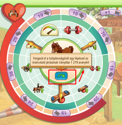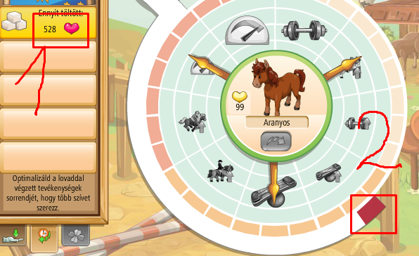 Zöld 5: Itt láthatjátok,hogy mennyi patkóért mennyi betanítási pontot kaptok (+ a bónusz betanítási pont,amit a pályák fejlesztése miatt kaptok minden 4 órás edzés során).Alatta van 1 csúszka.Ha ezt a csúszkát jobbra húzzátok,vagy a jobb oldalon található fehér + jelet nyomkodjátok,akkor növelhetitek a patkók számát,ezáltal a betanítási pontok száma is nő.